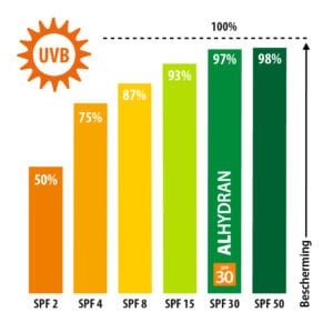 Alhydran with SPF protects against both UVA and UVB rays. If your skin is damaged or if you have scars, it’s extra important to protect your skin well against both types of UV rays.